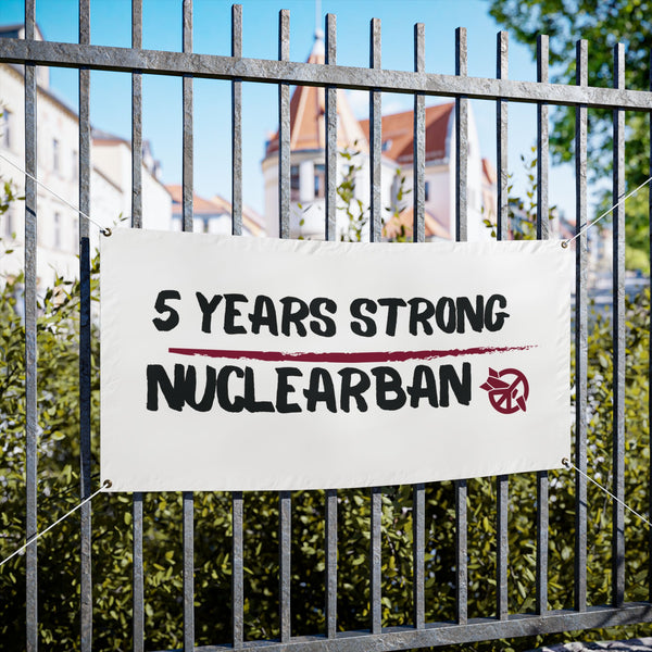 If we counted every use for a banner, we'd be here all day. This 48" x 24" (121 x 61 cm) banner - with gromets for hanging if needed - helps make the point loud and clear: 5 Years Strong | Nuclear Ban!