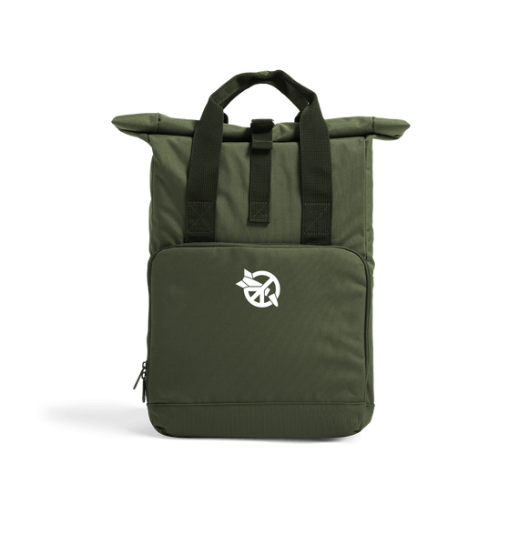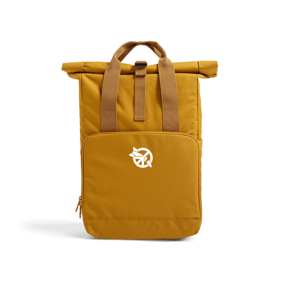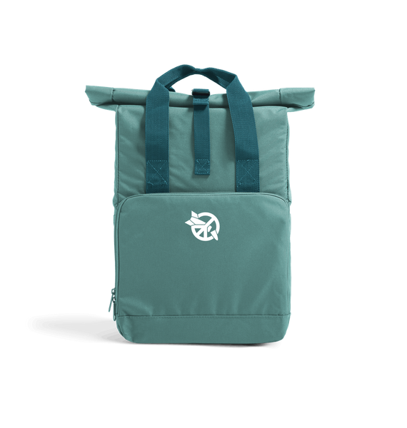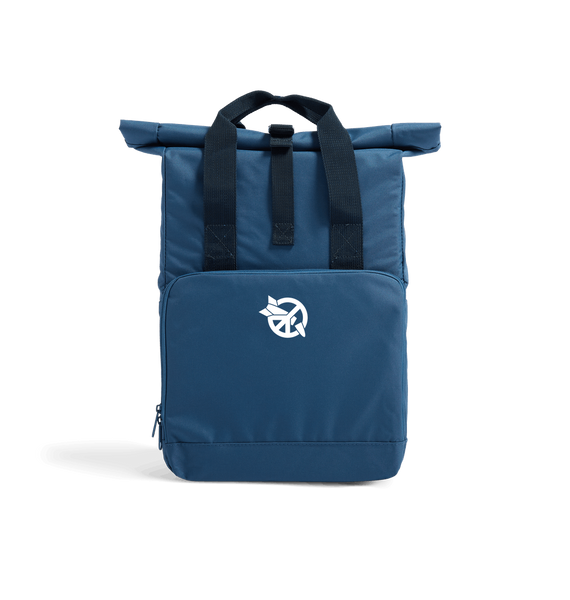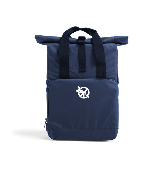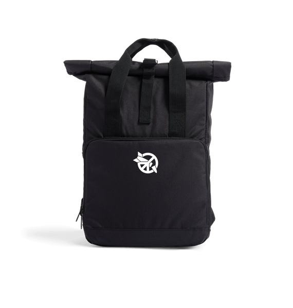 Recycled twin-handle backpack with roll-top closure. Featuring a front pocket organiser section, webbing carry handles and a zippered internal pocket. Back panel and adjustable shoulder straps are padded. 38 x 28 x 12 cm. 14 litre capacity. BSCI and Reach certified.